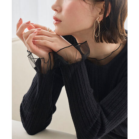 肌にやさしく馴染むリブニットとシアーチュールの異素材ドッキングデザイン。