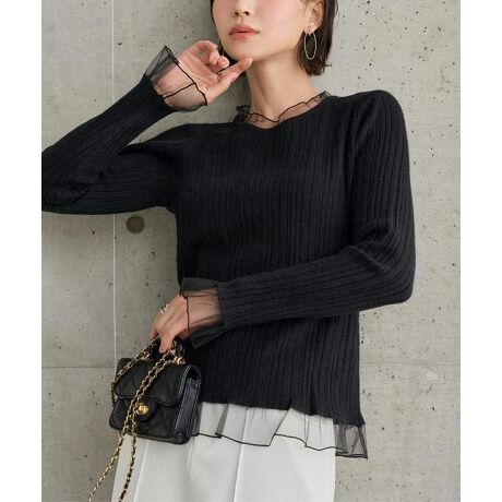 肌にやさしく馴染むリブニットとシアーチュールの異素材ドッキングデザイン。