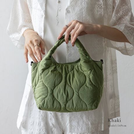 ふんわりキルティング素材の2wayミニトートバッグは、手持ちでもショルダーでも使える便利なデザイン。