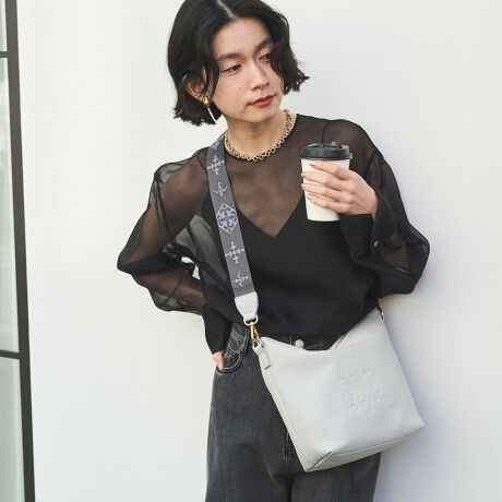 ・人気のモノグラムベルトを使用したロングショルダーベルトが、スタイリングのポイントに