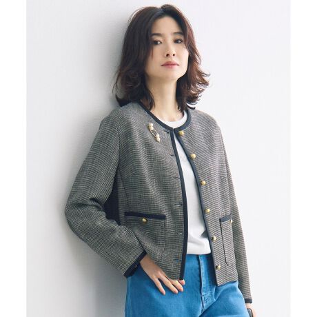 軽やかな着心地のきちんと見えライトジャケット■デザインほどよいボリューム感を持たせた、ボクシーシルエットのノーカラージャケットです。ややドロップさせた肩まわりが自然な抜け感を演出します。さらりとしたタッチで驚くほど軽やかな素材を使用しており、カーディガンのような快適な着心地が魅力です。メッシュのような表情のある素材のため蒸れにくく、春先から盛夏に向けて快適に羽織っていただけます。デイリーから通勤まで幅広いシーンで活躍する、頼れるアイテムです。■素材特殊な染色を施すスラブ糸を使用したカラミ組織の素材です。カラミ組織ならではの甘めに織られた生地のため非常に軽く、適度な伸縮性があり、独特のシャリ感とドライタッチの清涼感が最大の特徴です。さらに、太さにムラのあるスラブ糸を用いることで、梳毛調の表情を持つ上品な表面感に仕上げています。これからの季節に、オンオフ問わず幅広いシーンで活躍するコンフォータブルな素材です。