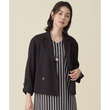 トレンド感と合わせやすさを兼ね備えたクロップド丈ジャケット■デザイントレンド感のあるクロップド丈のジャケットです。すっきりと着回しやすいバランスの着丈にこだわり、素材がもつナチュラルな風合いと、シャープな印象のダブル前デザインが好相性です。気負わずシャツのようにさらりと羽織れる、裏地なしの一枚仕立てで、ロングシーズン活躍します。ドロップショルダーがリラックス感と女性らしさを演出し、合わせるボトムを選ばず、さまざまな着こなしに取り入れていただけます。■素材麻見えを意識して作られた合成繊維素材です。スラブ調の糸を使用して表面に凹凸感を出し、よりナチュラルな天然素材の表情を実現しています。ストレッチ入りで着心地が良く、さらりとしたタッチと軽さ、通気性が特徴です。シワが目立ちにくく、キレイ見えし、接触冷感機能付きなのもポイントです。■同素材ノースリーブブラウス(BLW7LS0306)テーラードジャケット(JKW7LS0306)タックスカート(SKW7LS0306)ワイドストレートパンツ(PRW7GM0302)