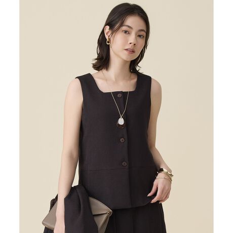 ジャケットインやレイヤードに頼れるノースリーブブラウス■デザインスクエアネックと広めの肩ラインが、さりげなくトレンド感を演出するノースリーブブラウスです。トップスとしてはもちろん、レイヤードアイテムとしても取り入れやすい、程よいゆとりのあるシルエットに仕上げました。Tシャツをインしてカジュアルに着こなしたり、ジャケットのインナーとして合わせれば、バランスの取れたスタイリングが完成します。通勤からちょっとしたお出かけまで、幅広いシーンで活躍する着まわし力の高いアイテムです。■素材麻見えを意識して作られた合成繊維素材です。スラブ調の糸を使用して表面に凹凸感を出し、よりナチュラルな天然素材の表情を実現しています。ストレッチ入りで着心地が良く、さらりとしたタッチと軽さ、通気性が特徴です。シワが目立ちにくく、キレイ見えし、接触冷感機能付きなのもポイントです。■同素材テーラードジャケット(JKW7LS0306)ショートジャケット(JKW7LS0306)タックスカート(SKW7LS0306)ワイドストレートパンツ(PRW7GM0302)