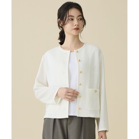 軽やかな着心地のきちんと見えライトジャケット■デザインほどよいボリューム感を持たせた、ボクシーシルエットのノーカラージャケットです。ややドロップさせた肩まわりが自然な抜け感を演出します。さらりとしたタッチで驚くほど軽やかな素材を使用しており、カーディガンのような快適な着心地が魅力です。メッシュのような表情のある素材のため蒸れにくく、春先から盛夏に向けて快適に羽織っていただけます。デイリーから通勤まで幅広いシーンで活躍する、頼れるアイテムです。■素材特殊な染色を施すスラブ糸を使用したカラミ組織の素材です。カラミ組織ならではの甘めに織られた生地のため非常に軽く、適度な伸縮性があり、独特のシャリ感とドライタッチの清涼感が最大の特徴です。さらに、太さにムラのあるスラブ糸を用いることで、梳毛調の表情を持つ上品な表面感に仕上げています。これからの季節に、オンオフ問わず幅広いシーンで活躍するコンフォータブルな素材です。