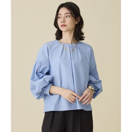 衿まわりはすっきり、袖はほんのりふんわりの華やぎブラウス■デザイン品よく肩の力が抜けた印象のラグランスリーブに肩まわりをすっきりと仕立てたブラウスです。袖の途中で切り替えを入れ、大胆なボリューム感を持たせたパフスリーブが魅力です。身頃は裾に向かって緩やかに広がるAラインシルエットで、存在感のあるパフスリーブにより、着ていただくだけで華やかなになります。袖口には部分的にゴムが入っているので、袖をたくし上げてさらにボリュームを出した着こなしも楽しんでいただけます。■素材無地は、ペットボトルや繊維くずなどを原料とした、帝人フロンティア社の商標素材「ECOPET(R)」ポリエステルを使用したサステナブル素材です。しなやかさがありながらも、適度なハリを兼ね備えた風合いが特徴です。ストライプは、オーガニックコットン100%の高密度平織素材です。程よいハリ感がありつつ、リラックス感のあるナチュラルな風合いに仕上げています。