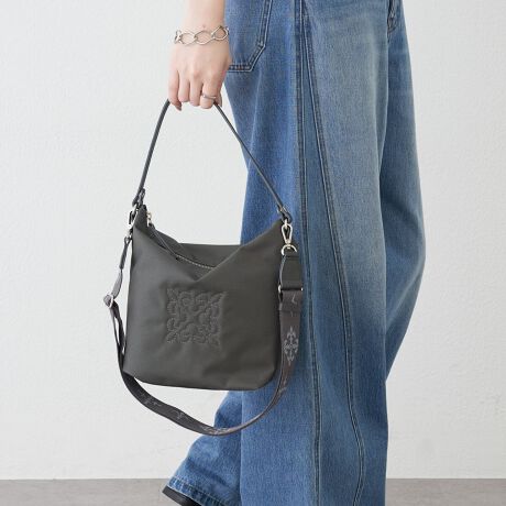 程よいハリ感のあるコーデュラナイロンに、さりげなく施したモノグラム刺繍が上品なアクセントを添えています。
