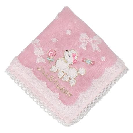 プードルとスイーツの刺繍がキュートなタオルハンカチ。小さなカバンでも持ち運びしやすいミニサイズもポイントの一つです。