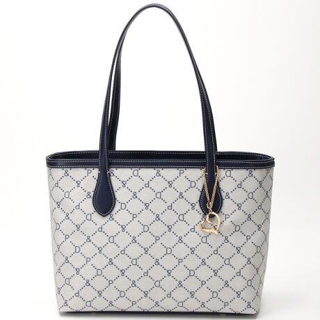 [型番:PDLHJAH1]定番のPD柄を爽やかなウォッシュデニム風プリントで表現したバッグシリーズ。PINKYではめずらしい大きめなハート型チャームが可愛らしくポイントになっています。トート型・2WAYハンド型にミニボストンを加えて、デイリーで使いやすい仕様に仕上げています。