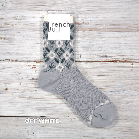 蔦と花をモチーフにしたレトロな柄のジャガード編みのソックスです。カラーはダークイエロー・オフホワイト・ブルーの3色展開です。シルケット加工を施した毛羽が少なく、光沢感のある綿糸を使用しました。程よい厚みに編み立てているため、快適な履き心地です。足首部分にはパッと目を引くフラワーモチーフ、つま先には波柄をあしらいました。細部にまでこだわったデザインで足元を華やかにしてくれる、コーディネートのアクセントになる1足です。