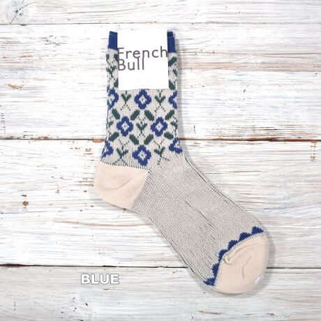 蔦と花をモチーフにしたレトロな柄のジャガード編みのソックスです。カラーはダークイエロー・オフホワイト・ブルーの3色展開です。シルケット加工を施した毛羽が少なく、光沢感のある綿糸を使用しました。程よい厚みに編み立てているため、快適な履き心地です。足首部分にはパッと目を引くフラワーモチーフ、つま先には波柄をあしらいました。細部にまでこだわったデザインで足元を華やかにしてくれる、コーディネートのアクセントになる1足です。