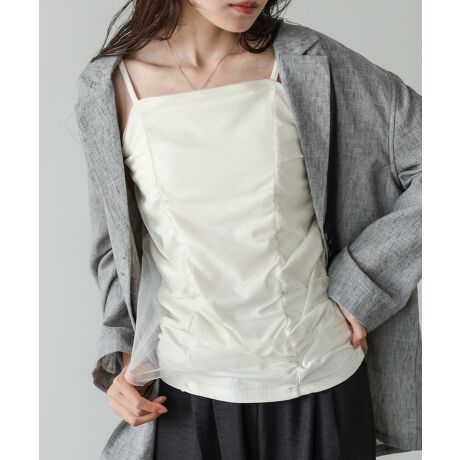 チュールをレイヤードした立体感のあるデザインが目を惹くカップ付きキャミソール。ギャザーの表情が女性らしさを引き立て、インナーとしてはもちろん、トップス感覚でも着映えする一枚です。