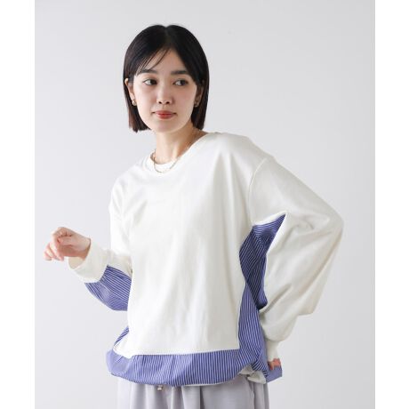 異素材を組み合わせたデザインが、大人のカジュアルに程よい抜け感を添える一枚。ゆったりとした着心地で体のラインを拾いにくく、日常にもお出かけにも自然になじみます。身頃はすっきり見えするシルエットに仕上げ、袖と裾にはストライプ生地をドッキング。動くたびにさりげないアクセントを生みます。裾にはドローコードをオンして気分によって調整OK。シンプルなのに印象に残る、着るだけでこなれた雰囲気が完成するカットソーです。