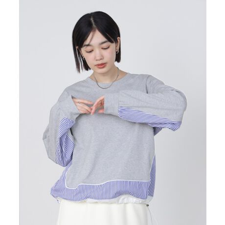 異素材を組み合わせたデザインが、大人のカジュアルに程よい抜け感を添える一枚。ゆったりとした着心地で体のラインを拾いにくく、日常にもお出かけにも自然になじみます。身頃はすっきり見えするシルエットに仕上げ、袖と裾にはストライプ生地をドッキング。動くたびにさりげないアクセントを生みます。裾にはドローコードをオンして気分によって調整OK。シンプルなのに印象に残る、着るだけでこなれた雰囲気が完成するカットソーです。