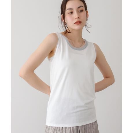 毎年人気のタンクトップが新色を追加して今年も登場。チェーンとシルバーモチーフでアクセントをつけたシンプルタンクトップ。ネックラインには、チュールとキラキラとしたラメ感のある糸を使用したアビガイルチェーンをレイヤードし、さりげない華やかさをプラス。一枚インナーに入れるだけで、ネックレスいらずで顔まわりを明るく見せてくれます。