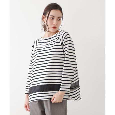 毎年人気のWシルケットシリーズからNEWアイテムのシアーラインプルオーバーです。デコルテがスッキリ見えるボートネックと、アウターを羽織った時も見える裾のシアーラインが◎