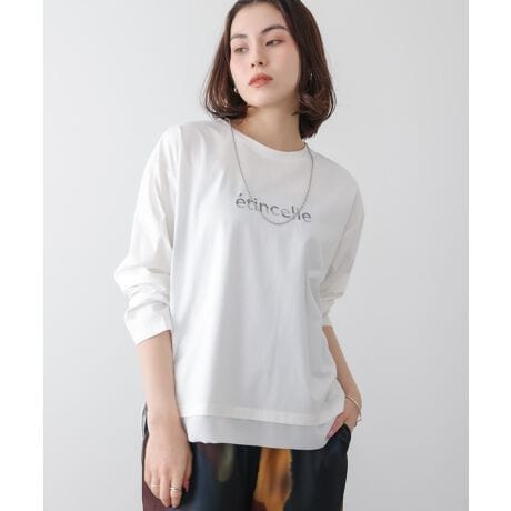 カジュアルになりがちなロンTを、ぐっと上品に仕上げた一枚。毎日の着こなしに自然になじみます。パンツにもスカートにも合わせやすく、着回し力も抜群です。胸元には控えめなシルバーの刺しゅうロゴ。ほのかな箔のきらめきが、大人にちょうどいいアクセントになります。裾にはシフォン生地を重ね、動くたびに軽やかな表情をプラス。シンプルなシルエットで、すっきり着られるのも魅力です。