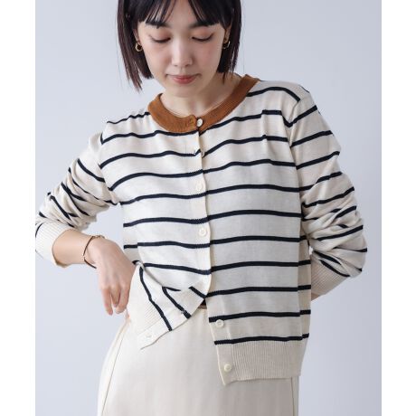 ベーシックなボーダーに、さりげない遊び心を添えたクルーカーディガン。襟元の配色デザインが顔まわりを明るく見せ、シンプルな中にも印象的なアクセントをプラスします。ほどよいサイズ感で体にフィットしすぎず、すっきりとしたシルエットに。ボタンを閉じてトップス風にも、羽織りとしても使えるので、着こなしの幅が広がります。カジュアルになりすぎず、大人のデイリーにちょうどいい一枚です。