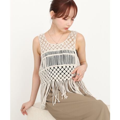 昨年人気だった着るだけで春夏ムードが高まるマクラメベストが新デザインとなって再登場!2パターンの網目でお好みの雰囲気をお楽しみいただけます。動きのあるフリンジが気になる部分をさりげなくカバーしつつ同時にオシャレもかなう優秀アイテムです。