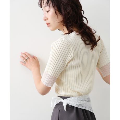 部分的に施された透け感が魅力的なシアー使いリブニットトップス。クルーネックでオンでもオフでも使えるアイテムなのでカジュアルからオフィスシーンまでご着用いただけるアイテムになっています。衿ぐりと袖口にさりげなく施されたシアーニットはきらめくニット素材を使用し、シンプルなデザインにちょっとした華やかさをプラス。フロントのランダムなリブデザインが着映えも叶えてくれる、色違いで揃えたくなる万能トップスです。