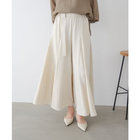 腰まわりをすっきり見せるポイントベルトがアクセントになり、トップスをインするだけでコーディネートが完成。裾に向かって広がるフレアーシルエットが、動くたびに女性らしい表情を生み出します。生地分量にゆとりがあり、脚のラインを拾いにくく、体型カバーにもおすすめ。