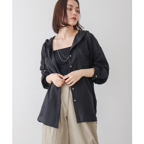 カジュアルになりがちなフード付きデザインを、艶やかなメタルカラーのボタンでクラスアップ。ブラウスのような上品な生地感と、体が泳ぐゆったりとしたシルエットが、女性らしさを引き立てます。ラフに羽織るだけで、都会的な大人のデイリースタイルが完成する一着です。