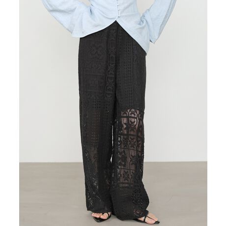 異なるレースを組み合わせたパッチワークデザインが目を惹くパンツ。繊細な刺繍が縦ラインを強調し、リラックス感のあるシルエットながらもすっきりとした印象に仕上げてくれます。ナチュラルな風合いとクラフト感が、大人の抜け感スタイルにぴったりの一着です。