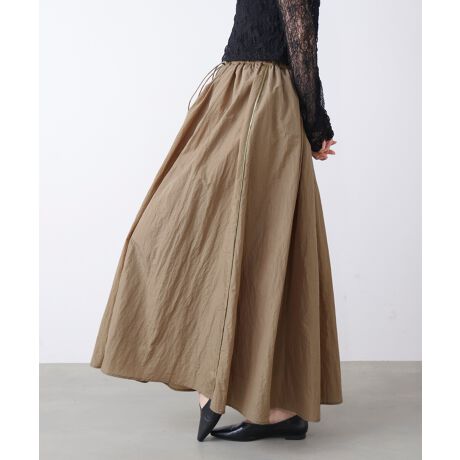 スポーティーな雰囲気を取り入れながら、フレアシルエットで女性らしさも忘れないスカートです。動くたびにふんわり広がり、気負わずおしゃれが楽しめます。シャカっとした軽い素材感が、コーデにほどよい抜け感をプラス。ウエストは総ゴム仕様にドローコード付きで、自分好みにフィット感を調整できます。両サイドの配色ラインがさりげないアクセントになり、縦のラインを強調してすっきり見えも叶えます。裏地付きなので透け感を気にせず、安心して着用いただけます。