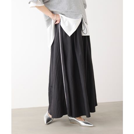 スポーティーな雰囲気を取り入れながら、フレアシルエットで女性らしさも忘れないスカートです。動くたびにふんわり広がり、気負わずおしゃれが楽しめます。シャカっとした軽い素材感が、コーデにほどよい抜け感をプラス。ウエストは総ゴム仕様にドローコード付きで、自分好みにフィット感を調整できます。両サイドの配色ラインがさりげないアクセントになり、縦のラインを強調してすっきり見えも叶えます。裏地付きなので透け感を気にせず、安心して着用いただけます。
