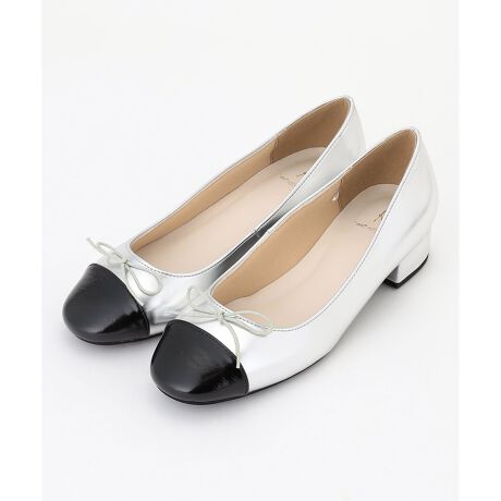 洗練された印象を与えるバイカラーデザインのヒール付きバレエシューズ