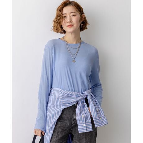 シンプルなクルーネックで仕立てた、ベーシックな長袖カットソーです。コンパクトなシルエットながら、肌に張り付かない絶妙なサイジングにこだわっており、一枚ではもちろん、カラー違いで重ねてもすっきりと着こなせます。トレンドのシアー感を取り入れたデザインは、ジャケットやカーディガン、ニットのインナーとして襟元や袖口から覗かせるだけで、コーディネートに抜け感と奥行きをプラスします。季節を問わずオールシーズン活躍する汎用性の高さも魅力です。 カラーは、どんなアイテムとも馴染むクリーンなホワイト(#001)、シックで着こなしを引き締めるブラック(#005)、顔周りをパッと明るく華やかに見せるピンク(#012)、ニュアンスのある色味で大人っぽいスモーキーグリーン(#063)、清涼感があり洗練された印象のスカイブルー(#072)、柔らかなトーンで優しげなライトイエロー(#042)の6色展開です。