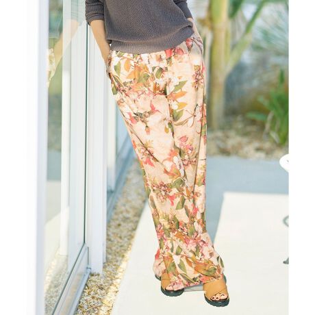 スタイリングに華やかさをプラスしてくれるパンツ■デザインウエストゴムを使用した履き心地のよいドロストパンツです。ウエストにタックを入れることで程よいゆとりを持たせた、ワイドシルエットが特徴です。ウエストまわりとドロスト部分は、プリントと連動させた無地で切り替え、全体をすっきりと見せるデザインに仕上げました。大胆なボタニカル柄が存在感を放ち、シンプルなトップスを合わせるだけで大人っぽく印象的なスタイリングをお楽しみいただけます。■素材軽さとしなやかさ、シアー感が特徴のコットンライクなタッチのボイル素材に、大胆なボタニカル柄をプリントしました。様々な植物を大胆に構成し、写実的な描写で仕上げた印象的な花柄がポイントです。■同素材ワンピース(OPW7LM0320)