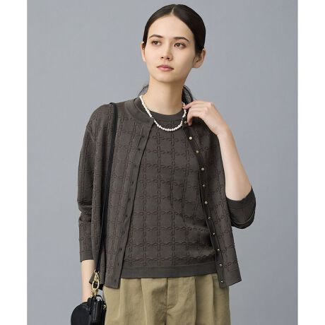 さりげない光沢で品よく羽織れるシンプルカーディガン■デザイン素材の持つ上品な光沢感を活かした、シンプルなカーディガンです。クラシックになりすぎないよう、肩を少しだけドロップさせ、程よくリラックス感のあるシルエットに仕上げています。アクセサリー感覚で楽しめる華奢で小さなメタル釦は、間隔を詰めて配置することで、自由区らしいオリジナリティを感じさせるディテールにしています。■素材程よいハリ・コシと上品な光沢が特徴の、国内素材を使用したアセテート高混率素材です。ソフトでシャリみのある風合いと、美しい発色も魅力。表側はアセテートならではの繊細な光沢と滑らかなタッチ、肌に触れる裏面にはコットン素材を使用し、快適な着心地を叶えています。暑い時期から長いシーズンにわたって着用できる素材です。また、ジャカード組織にすることでテーマ性を持たせ、よりキャッチーな編み柄に仕上げています。■同素材Tシャツプルオーバー(KRWRLM0358)