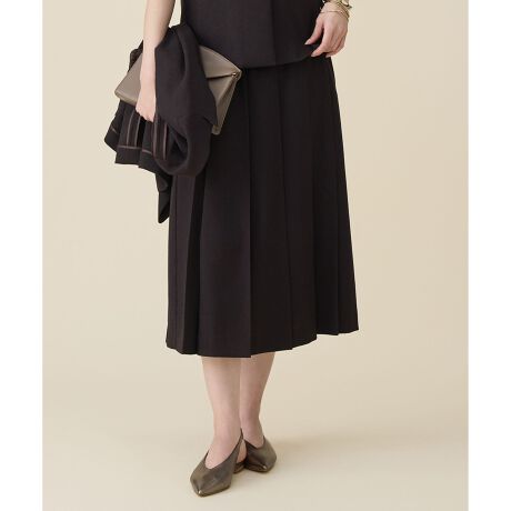 通勤にも頼れるプリーツ見えタックスカート■デザインプリーツのように見えるタックデザインが印象的なタックスカートです。プリーツ加工ではなく、タックの奥を一本ずつ裏側で縫い留めることで、プリーツのような立体感と美しいラインをキープしたAラインシルエットに仕上げています。歩くたびにタックがふんわりと広がり、上品でありながらシャープな佇まいを演出します。ウエストは総ゴム仕様で、きちんと感がありながらも快適な着心地です。ブラウスはもちろん、カットソーとも好相性で通勤シーンをはじめ、オンオフ問わず着用いただけます。■素材麻見えを意識して作られた合成繊維素材です。スラブ調の糸を使用して表面に凹凸感を出し、よりナチュラルな天然素材の表情を実現しています。ストレッチ入りで着心地が良く、さらりとしたタッチと軽さ、通気性が特徴です。シワが目立ちにくく、キレイ見えし、接触冷感機能付きなのもポイントです。■同素材ノースリーブブラウス(BLWRLS0306)ショートジャケット(JKWRLS0307)テーラードジャケット(JKWRLS0306)ワイドストレートパンツ(PRWRGM0302)