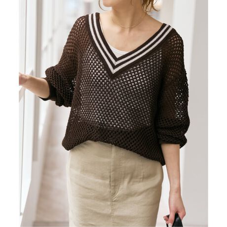 Vネックならではのすっきりとした印象と、透かし編みの軽やかな表情が魅力のチルデンニット。