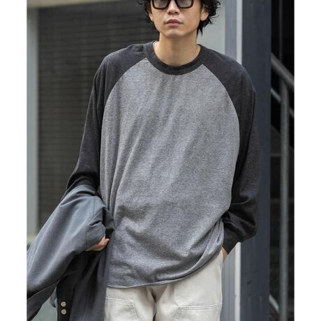 ベースボールTの従来であるディティールの配色のラグランスリーブやバインダーネック、裾のロック始末などのディティールは踏襲しつつ、袖口にはリブをつけ、