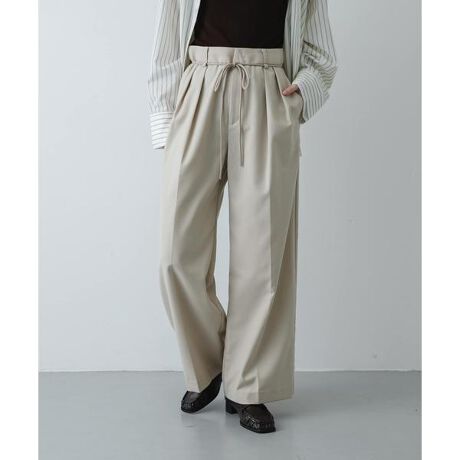 しなやかで品格漂うスラックス生地を使用しており、オンオフを問わず洗練された印象を与えます。最大のポイントは、共仕立ての繊細なコードベルト。ベルトをきゅっと結ぶことで、シンプルなウエスト周りにさりげない表情とモダンなニュアンスが生まれます。縦のラインを強調するセンタープレスを施しているため、ゆったりとしたワイドシルエットながらも、立ち姿は驚くほどスマート。快適な履き心地と、凛とした美しさを両立させた実力派のボトムスです。