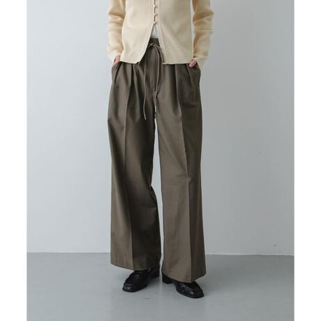 しなやかで品格漂うスラックス生地を使用しており、オンオフを問わず洗練された印象を与えます。最大のポイントは、共仕立ての繊細なコードベルト。ベルトをきゅっと結ぶことで、シンプルなウエスト周りにさりげない表情とモダンなニュアンスが生まれます。縦のラインを強調するセンタープレスを施しているため、ゆったりとしたワイドシルエットながらも、立ち姿は驚くほどスマート。快適な履き心地と、凛とした美しさを両立させた実力派のボトムスです。