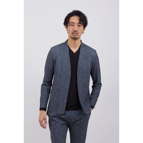 ホップサック調のプリントを施した、4WAYストレッチトリコット素材を使用したノーカラージャケット。通気性に優れたメッシュ構造により、サラッとした肌ざわりと快適な着心地を実現しました。程よくきちんと感のあるデザインで、デイリー使いはもちろん、テレワークなどのシーンでもラフになり過ぎない印象で着用いただけます。同素材のパンツと合わせた、軽快でスマートなセットアップスタイルもおすすめです。