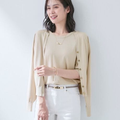 カーディガンは、衿開きのあるデザインで程よい抜け感を演出。