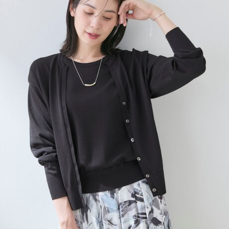 カーディガンは、衿開きのあるデザインで程よい抜け感を演出。