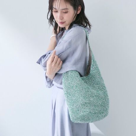 カゴバッグのようなナチュラルな表情を持ちながら、糸の華やかな光沢がモードな印象を与えます。