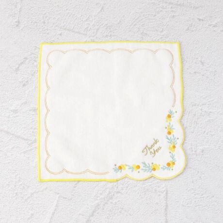 ミモザモチーフの刺繍とメッセージを添えたタオルハンカチーフ。