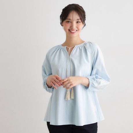 ネックラインにタッセル付きの紐が施された、カジュアルフェミニンなギャザーブラウスです。