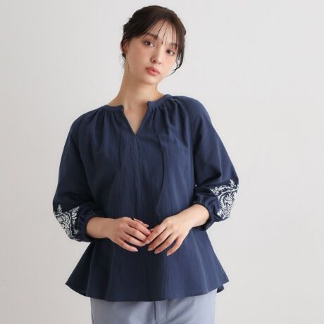 袖口に入った大きなボタニカル刺繍がアクセントとなり、シンプルながら特別感のある一枚に仕上がっています。