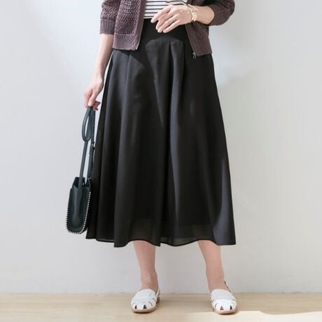 ウエストのタックデザインで腰回りはすっきりとみせ、裾にかけて広がるフレアシルエットは女性らしさがあり軽やかに見せてくれます。