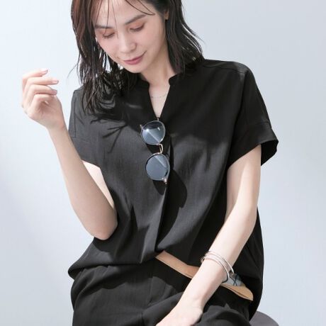 きちんと感のあるバンドカラーとタックデザインで通勤スタイルでも活躍するアイテムです。