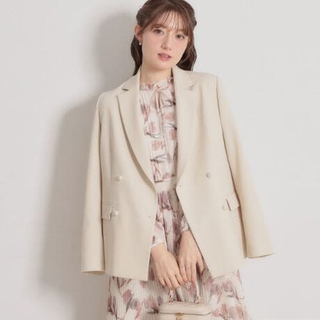 トレンドであるテーラージャケットを、小さめの襟やパール調ボタンで可愛く仕上げました。