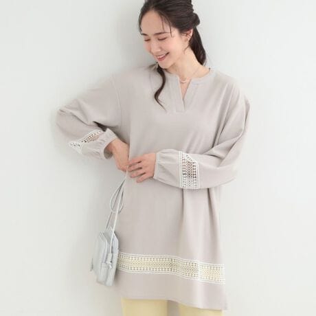 袖口と裾にあしらったレース切替が、さりげない華やかさをプラス。