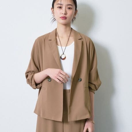 マニッシュなダブルブレストのデザインと、リラックス感のあるドルマンスリーブを融合させたトレンドジャケットです。