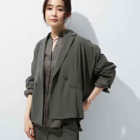 マニッシュなダブルブレストのデザインと、リラックス感のあるドルマンスリーブを融合させたトレンドジャケットです。